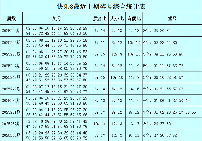福彩快乐8第2025253期开出奖号:03 10 20 23 27 30 32 35 44 48 50 51 53 56 57 63 65 68 70 72,其中奖号质合比为3:17,四区比为3:5:7:5,包含4个重号27、30、53、68,包含连码50 51、56 57,包含10个邻号20 32 44 48 50 57 63 65 70 72。