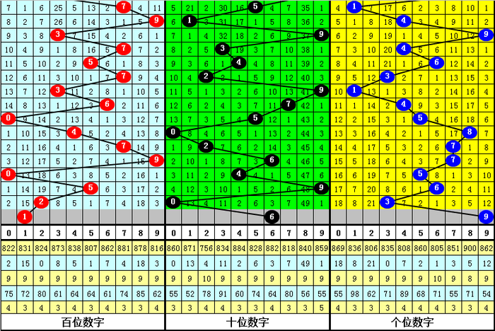 个位上期奖号为3,下降3点,本期预计该位转向,参考9。