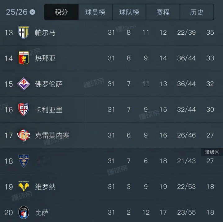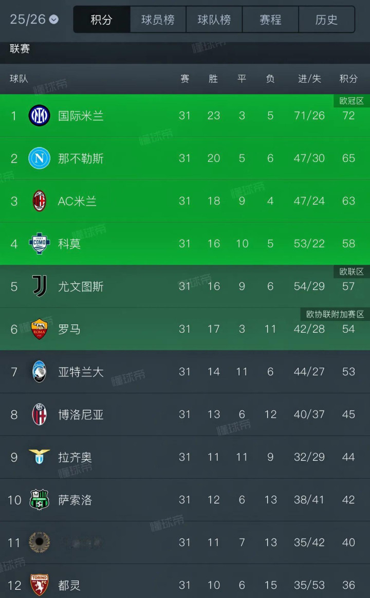 意甲第31轮上演悲喜夜:亚特兰大客场3-0大胜莱切,继续冲击欧战区但面临魔鬼赛程;科莫客场0-0憾平乌迪内斯,无缘六连胜但以15场零封并列意甲防守最佳;那不勒斯主场1-0力克AC米兰,保持赛季主场不败并反超对手升至积分榜第二;尤文图斯2-0击败热那亚,取得联赛5轮不败,距欧冠区仅1分,主帅斯帕莱蒂达成意甲300胜里程碑。本轮后积分榜更新,米兰63分跌至第三,那不勒斯65分升至第二,争四与争冠形势愈发激烈。