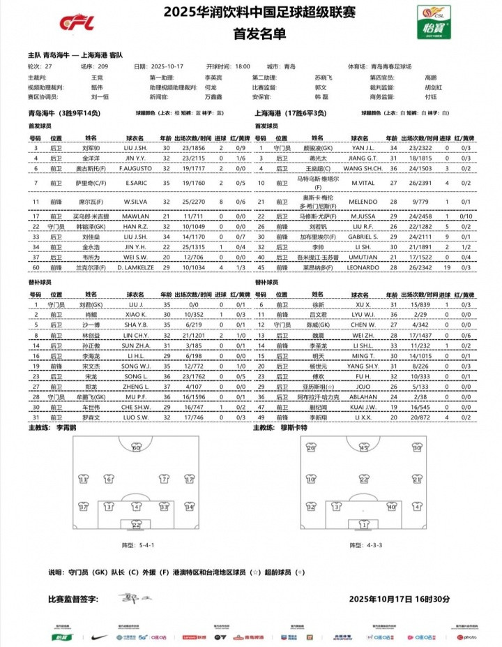 直播吧10月17日讯北京时间18点,中超第27轮,青岛海牛主场迎战上海海港,赛前双方公布首发。
