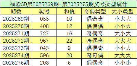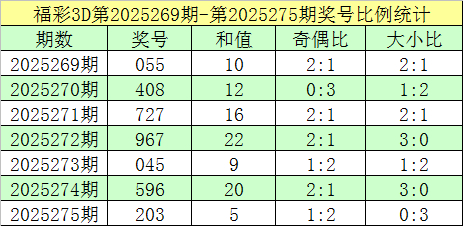 福彩3D第2025275期回顾:奖号为203,奖号奇偶比为1:2,大小比为0:3,和值为5,类型为组六。
