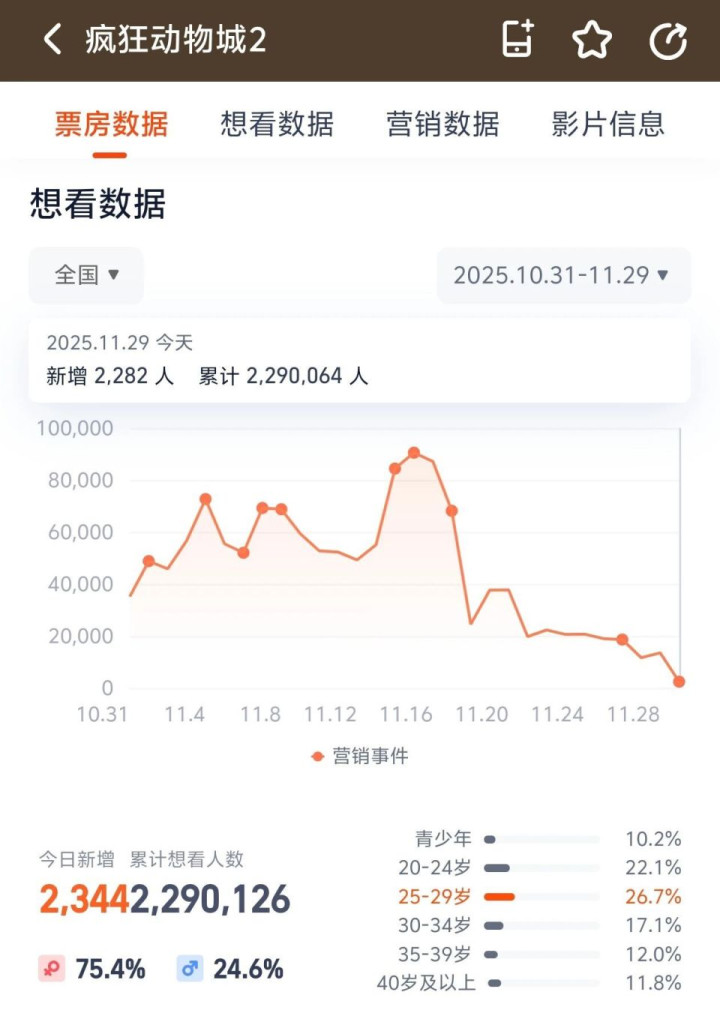 值得关注的是,《疯狂动物城2》累计想看人数目前已近229万人,高于《哪吒2》累计想看人数132万人。同时,11月29日《疯狂动物城2》排片量高达34.6万场,远超《哪吒2》创下的25.5万场的最高日排片纪录。