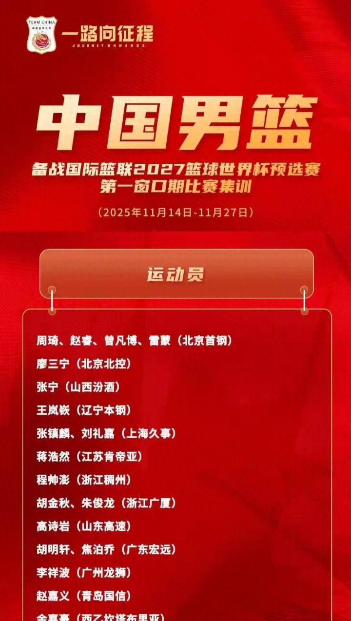 中国男篮公布了参加世预赛首个窗口期的球员大名单。其中北京北汽成为了最大赢家,本次征召有多达四名球员入选。周琦、张镇麟、王岚嵚时隔近一年时间,终于再次回归国家队。