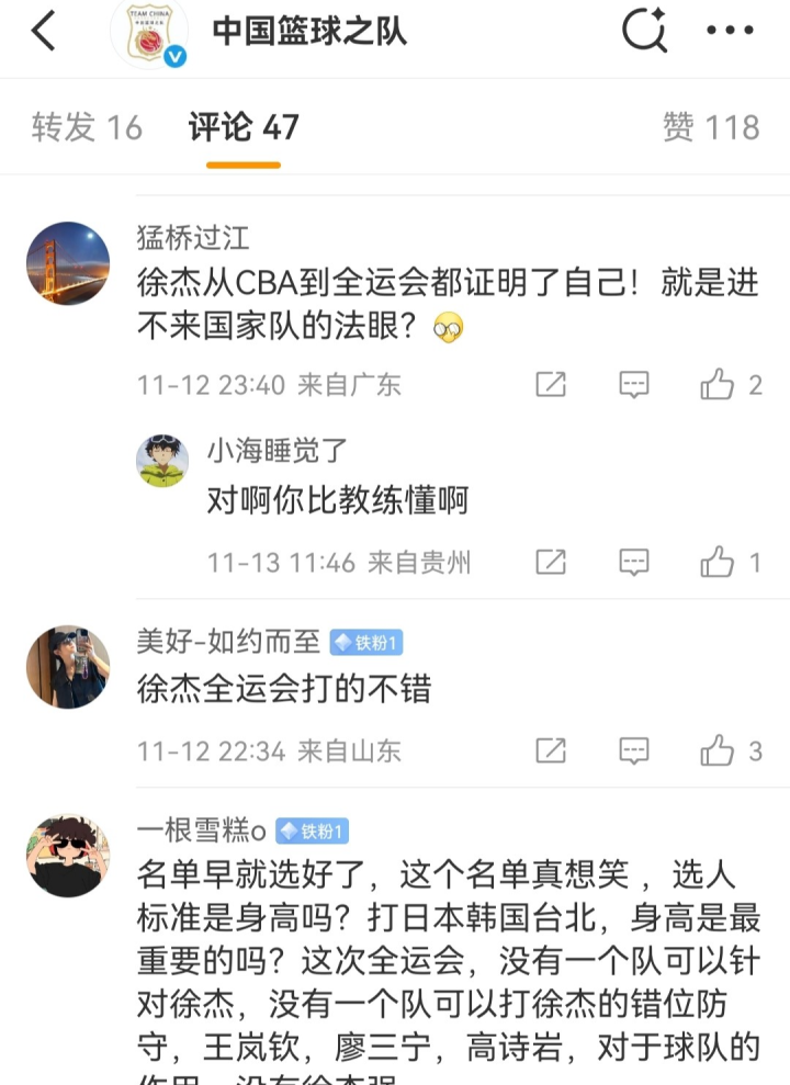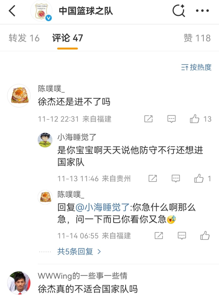 而徐杰的落选,是这五名球员中最具争议的话题。很多球迷都在中国篮球之队的微博下留言,呼吁国家队应该带上徐杰。